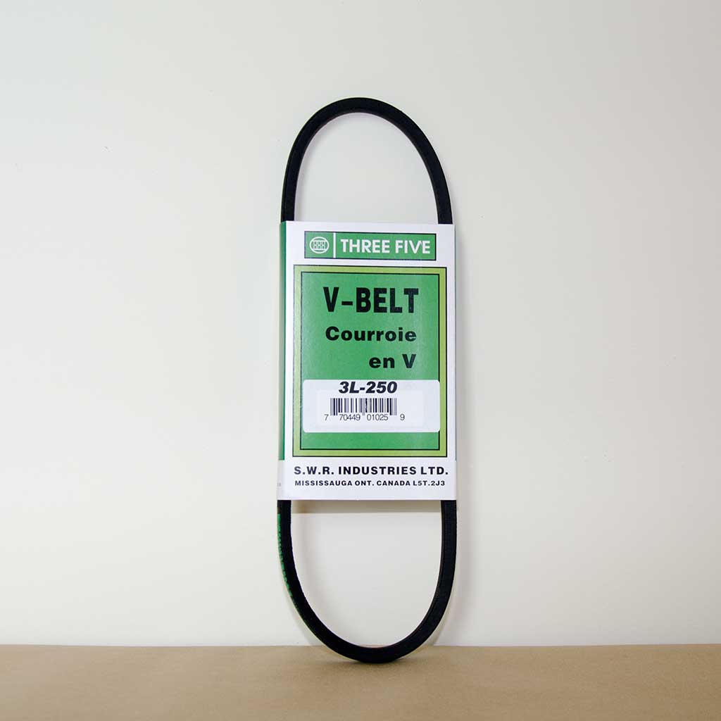 THREE FIVE FHP (Fractional Horse Power) V-belts provide the highest mean power transmission for every conceivable type of small machine.  These are manufactured with a durable layer of continuous polyester cable cord, which forms the load-carrying section and is precisely positioned to prevent the belt from flexing and distorting.